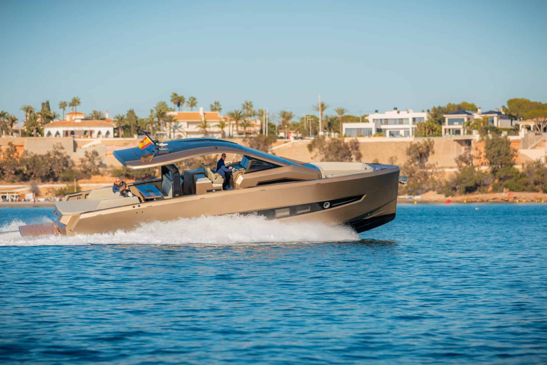 Twin inboard engines with around 1,200 horsepower give her a top speed close to 40 knots. Whether you are cruising along the Ibiza coastline or heading quickly across to Formentera, the ride stays smooth and steady.